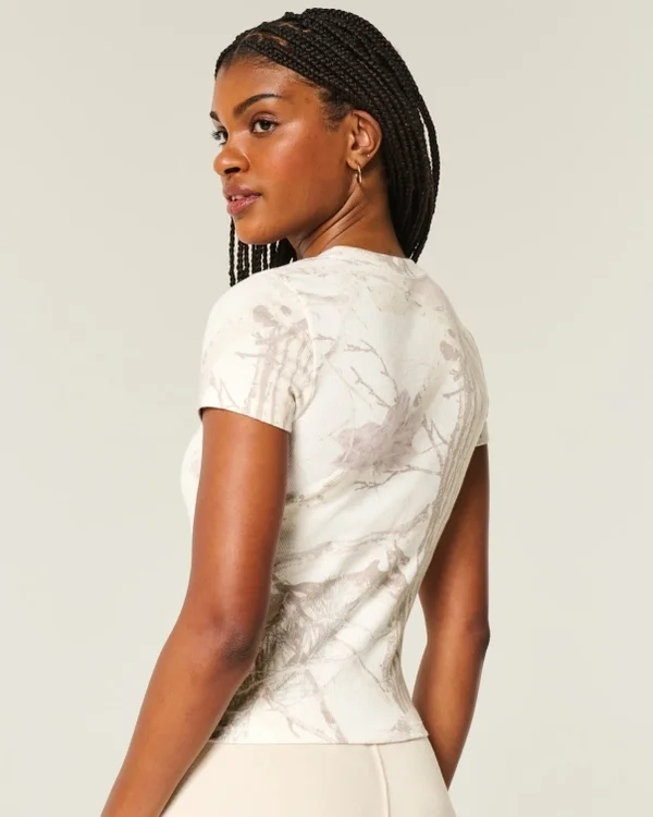 Esta bonita camiseta para bebé, supersuave, tiene un diseño ligeramente entallado y presenta un estampado de camuflaje en toda la prenda. Cuello redondo y manga corta.