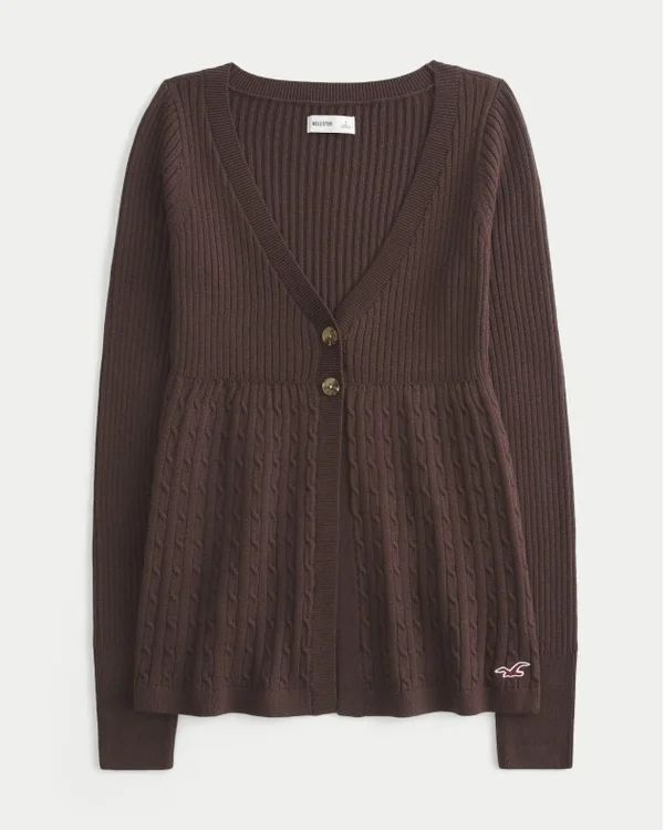 Este jersey bonito y supersuave está diseñado con una silueta babydoll y un dobladillo voluminoso. Patrones de punto trenzado, escote en V, cierre de 2 botones, icono del logotipo bordado en el dobladillo, manga larga.