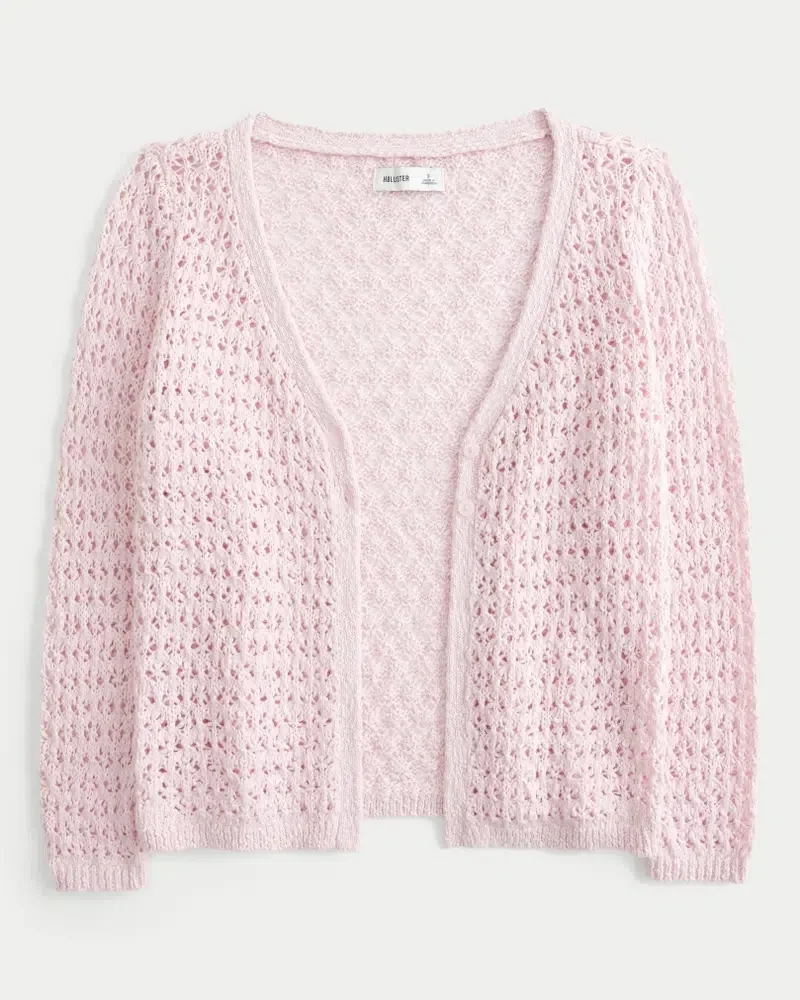 Cómodo cárdigan de tejido de ganchillo con cuello en V y mangas 3/4. Dos botones en la parte delantera. Corte ajustado.