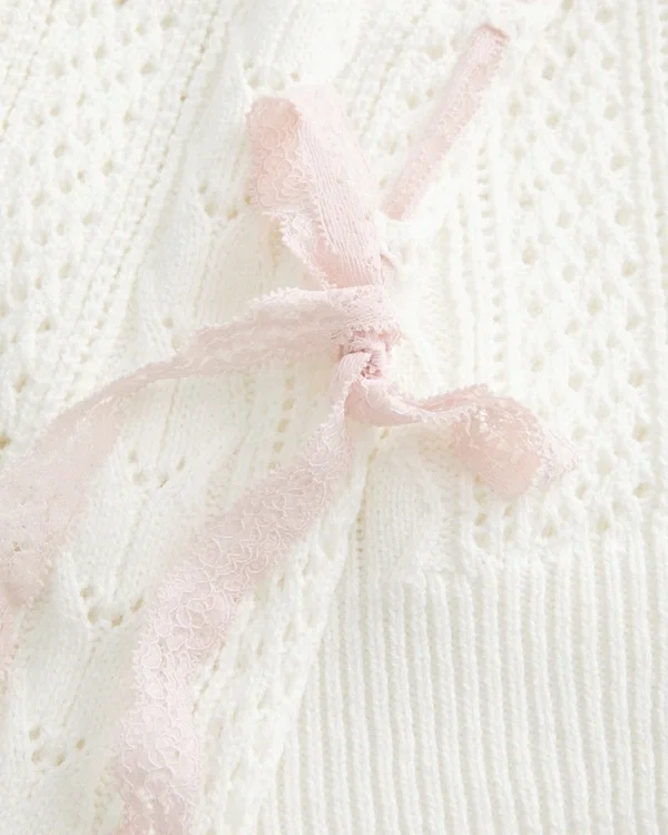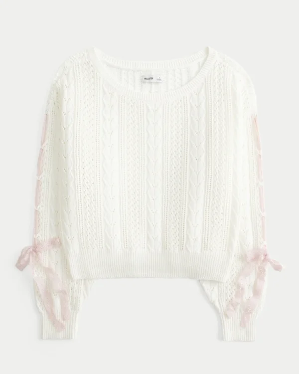 Este jersey supersuave y cómodo presenta bonitos lazos de encaje en las mangas y patrones de punto trenzado de punto abierto. Ribetes acanalados, cuello holgado y mangas largas.