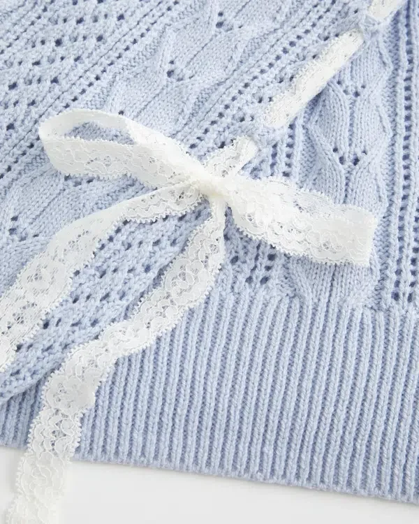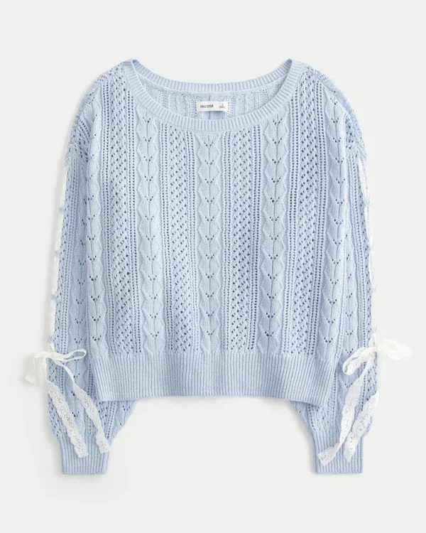 Este jersey supersuave y cómodo presenta bonitos lazos de encaje en las mangas y patrones de punto trenzado de punto abierto. Ribetes acanalados, cuello holgado y mangas largas.